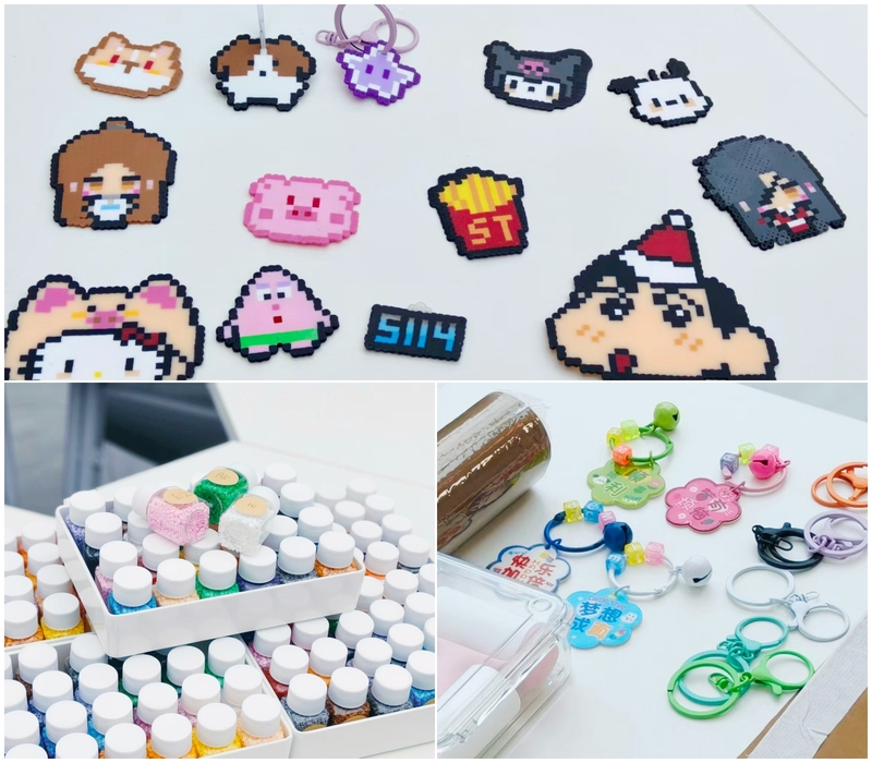 活動場地內,長條桌鋪著淺色桌布,透明收納盒整齊排列,其中分門別類盛放著紅如櫻桃、藍似海水、黃如陽光等各色拼豆,更有漸變色與閃粉豆點綴其間,在燈光映照下熠熠生輝,激發了同學們的創作興趣。桌角備有參考樣圖,涵蓋可愛動物、卡通形象、幾何圖形及祝福語句等多種主題,鑷子等工具一應俱全,為參與者提供了便利的創作條件。