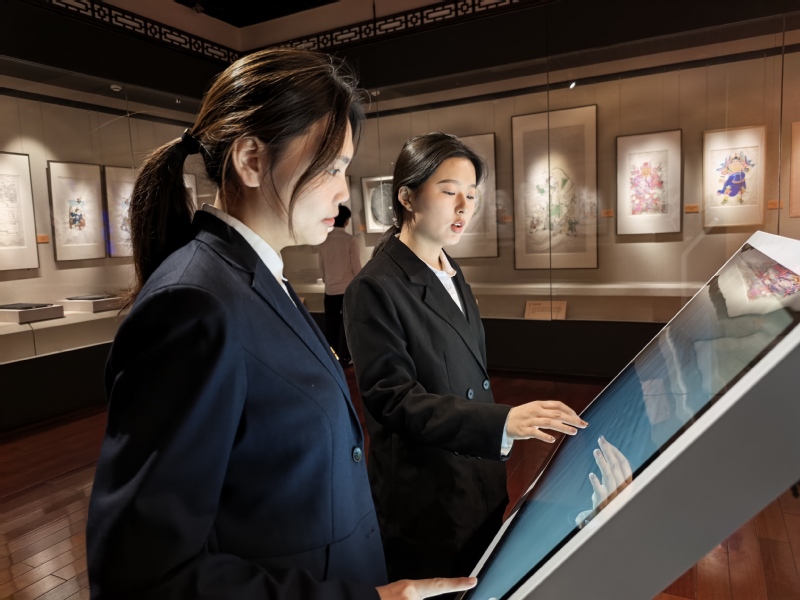 在“春秋淹城”展廳,一座氣勢(shì)恢宏的遺址復(fù)原沙盤吸引了學(xué)生們的目光。這座全國(guó)唯一保存完好的春秋時(shí)期地面城池遺址,讓同學(xué)們對(duì)先民的智慧與工匠精神有了深刻體會(huì)。學(xué)生黨員錢俊辰感慨道:“面對(duì)這些珍貴的文物,我深刻感受到古人精益求精的工匠精神。一寸緙絲需耗費(fèi)一日心血,一件華服需半年織就,這種執(zhí)著專注的匠心讓人敬佩。”臨展廳內(nèi)的年畫(huà)同樣吸引了學(xué)子們的目光。這些年畫(huà)展現(xiàn)了深厚的民間藝術(shù)積淀,體現(xiàn)了中華優(yōu)秀傳統(tǒng)文化中的思想觀念和人文精神。