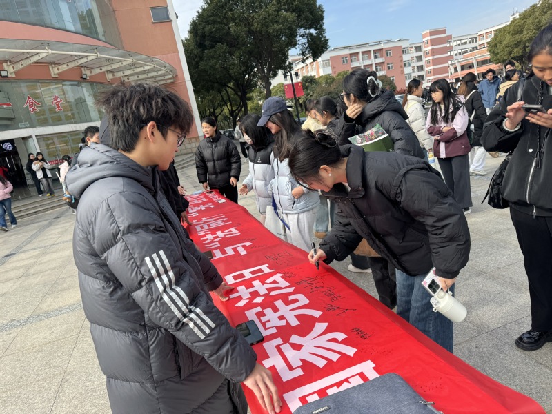 活動現場,部分老師和學生手持簽字筆,有序在長約5米的主題橫幅上鄭重簽下自己的名字,每一個簽名都代表著一份承諾、一份責任。馬克思主義學院院長李飛在簽字后表示:“這樣的活動很有意義,簽字的過程不僅是一種儀式,更讓我真切感受到憲法的嚴肅性,以后會多學習憲法知識,用法律保護自己的合法權益?!睂W生代表小李說道:“通過今天的活動,我明白了憲法不僅是書本上的條文,更是保護我們成長的‘護身符’,今后會爭做憲法的忠實崇尚者和自覺遵守者。”法治宣講團成員還在活動現場通過法治知識問答、憲法條文誦讀等互動形式,讓同學們在輕松愉悅的氛圍中學習憲法知識,增強法治意識。