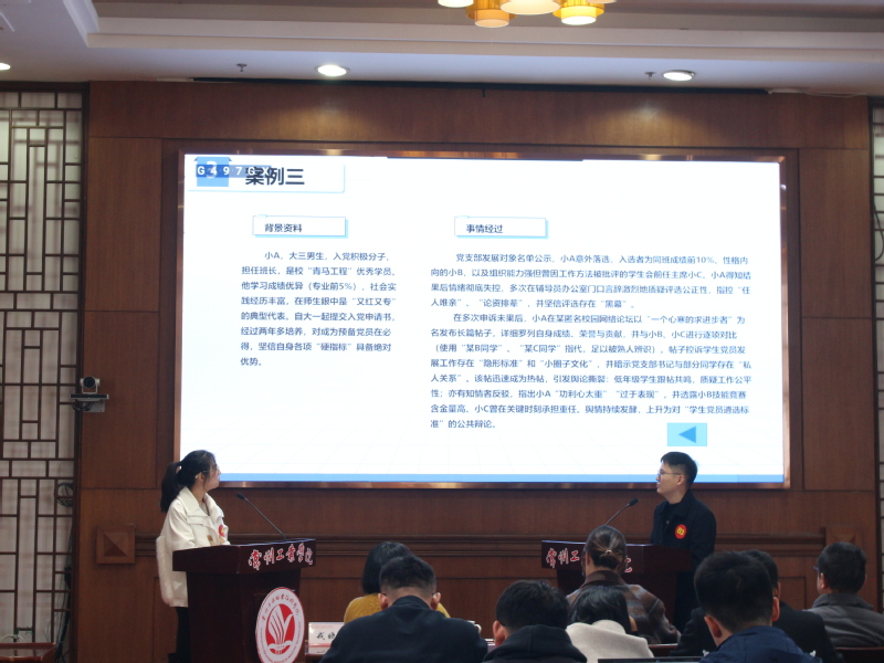 本次大賽遵循省賽規則,分為初賽(基礎知識測試)、復賽(案例研討)和決賽(談心談話)三個環節。初賽于11月13日舉行,共有73名輔導員參賽。測試采用閉卷筆試作答方式進行,共有20名輔導員脫穎而出,進入復賽。復賽于11月28日舉行,采用AB角問答方式進行。比賽以“我提問,你回答”的方式開展,由A、B選手圍繞案例共同辨析對策、總結方法。輔導員們思路清晰、分析透徹,展現了應對復雜情境的專業素養與邏輯思辨能力,共有9名選手進入決賽。決賽于12月11日進行,在談心談話中,輔導員們情真意切、循循善誘,充分體現了對學生成長的深切關愛與教育智慧。