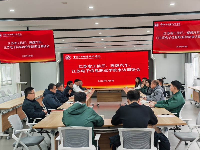 1月6日,江蘇省工業和信息化廳裝備二處副處長方松、理想汽車江蘇政府事務總監陳暢、江蘇電子信息職業學院汽車工程學院院長汪東明一行來我校調研交流。我校黨委書記席海濤出席會議,會議由副校長檀祝平主持。